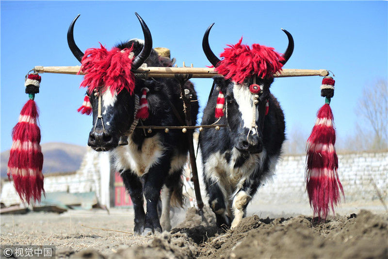 圖為白朗縣洛江鎮(zhèn)村民開(kāi)耕犁出新年的第一壟青稞田,據(jù)悉,每年開(kāi)耕節(jié)上,農(nóng)牧民都會(huì)裝扮自家的耕牛。