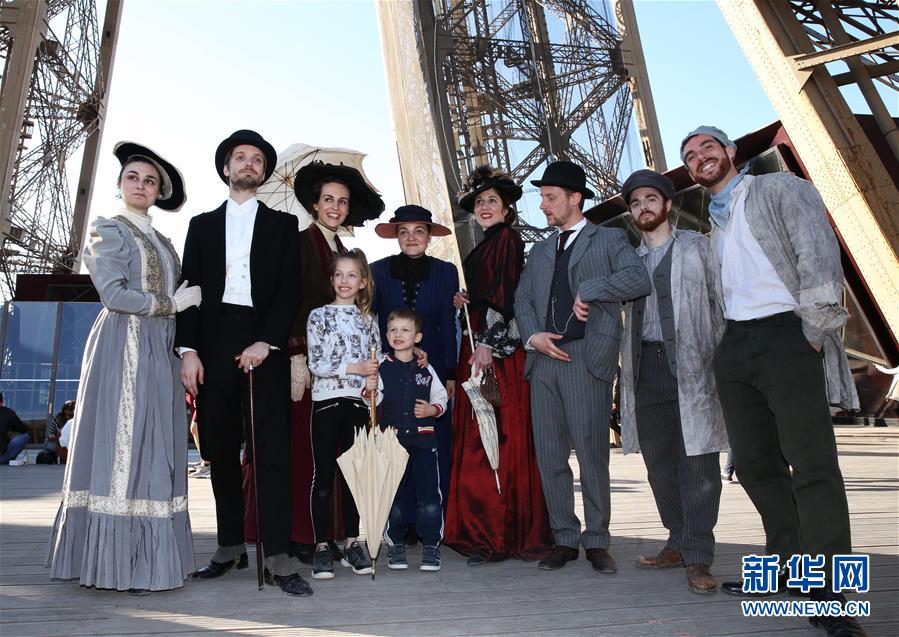 3月30日,在法國巴黎,音樂劇《300米高塔》的演員身著19世紀(jì)服裝在埃菲爾鐵塔一層平臺(tái)合影。于1889年3月31日正式落成的法國巴黎埃菲爾鐵塔迎來130歲生日。從30日起,包括演出、冒險(xiǎn)游戲、圖片展在內(nèi)的多項(xiàng)活動(dòng)在埃菲爾鐵塔舉行,為這座宏偉建筑慶生。新華社記者 高靜 攝