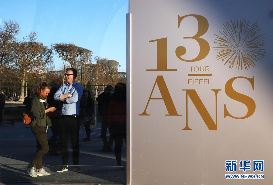 3月30日,在法國巴黎,人們走過慶祝埃菲爾鐵塔落成130周年的宣傳牌。于1889年3月31日正式落成的法國巴黎埃菲爾鐵塔迎來130歲生日。從30日起,包括演出、冒險(xiǎn)游戲、圖片展在內(nèi)的多項(xiàng)活動(dòng)在埃菲爾鐵塔舉行,為這座宏偉建筑慶生。新華社記者 高靜 攝
