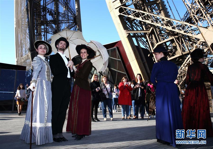 3月30日,在法國巴黎,音樂劇《300米高塔》的演員身著19世紀(jì)服裝在埃菲爾鐵塔一層平臺(tái)與游客合影。于1889年3月31日正式落成的法國巴黎埃菲爾鐵塔迎來130歲生日。從30日起,包括演出、冒險(xiǎn)游戲、圖片展在內(nèi)的多項(xiàng)活動(dòng)在埃菲爾鐵塔舉行,為這座宏偉建筑慶生。新華社記者 高靜 攝