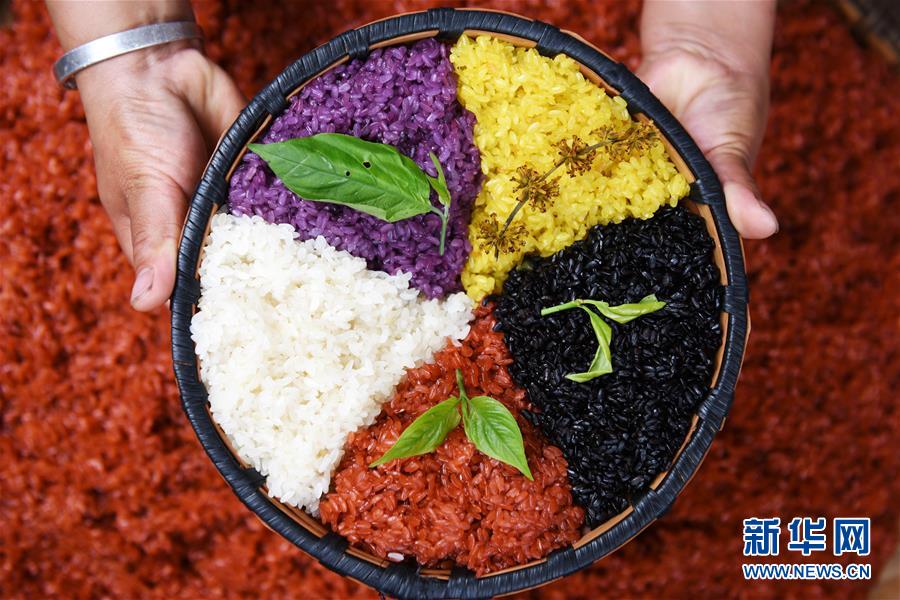 每年農(nóng)歷三月十五前后,貴州省黔東南苗族侗族自治州臺江縣苗族同胞有制作“姊妹飯”、喜迎姊妹節(jié)的習(xí)俗?!版⒚蔑垺笔鞘褂貌煌参锏臉淙~或花朵碾壓成汁液作為原色,對糯米進(jìn)行浸泡并蒸熟的五彩糯米飯。姊妹節(jié)期間,青年男子可以向心儀的姑娘討要“姊妹飯”,姑娘們則通過贈送藏有不同物品的“姊妹飯”傳情達(dá)意。