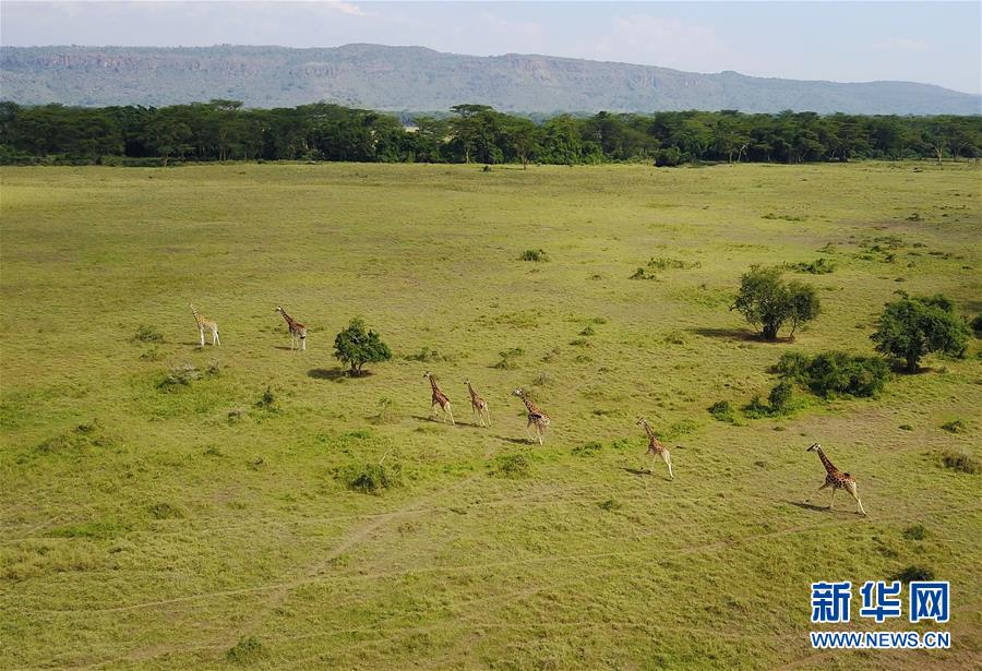這是2017年6月21日在肯尼亞納庫魯國家公園拍攝的奔跑中的長頸鹿。 新華社記者陳誠攝