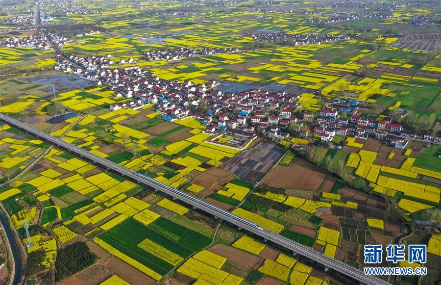 在陜西省漢中市城固縣境內(nèi),高鐵穿行在盛開的油菜花田間(3月28日無人機(jī)拍攝)。 新華社發(fā)(羅漢濤 攝)