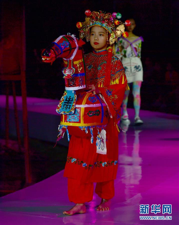 4月27日,小模特身穿民族服飾展示土樓當地的非物質文化遺產竹馬戲。 當日,土樓光語國際時尚大秀在福建省南靖縣的土樓裕昌樓內舉行。這場融匯文化、時尚與旅游元素的大秀,通過傳統(tǒng)與時尚的有機融合,展現南靖土樓及文化的魅力和風采。 新華社記者魏培全攝