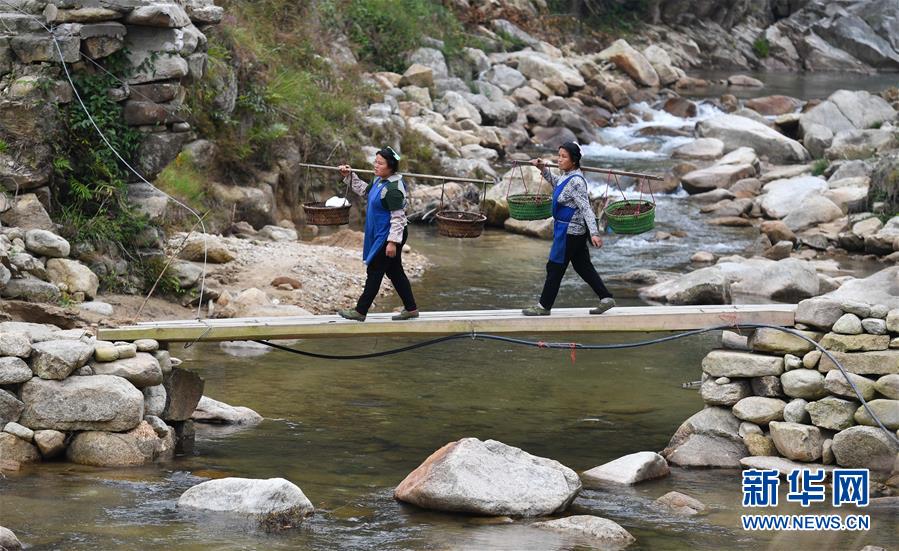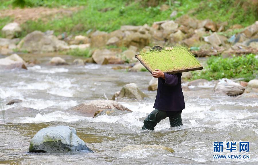 在黔桂烏英苗寨,村民扛著秧苗過河,準(zhǔn)備插秧(4月16日攝)。  新華社記者 黃孝邦 攝