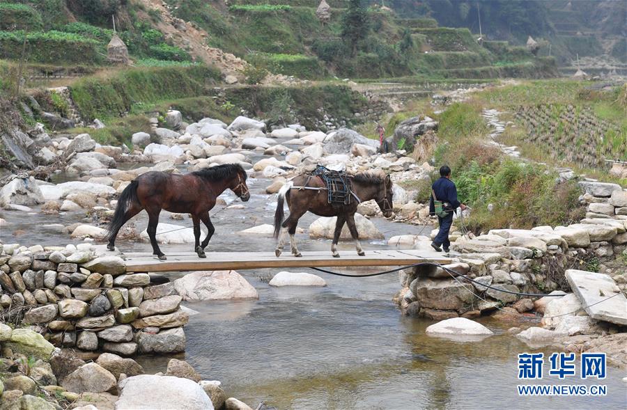 在黔桂烏英苗寨,村民牽馬上山勞作(2017年11月10日攝)。  新華社記者 黃孝邦 攝