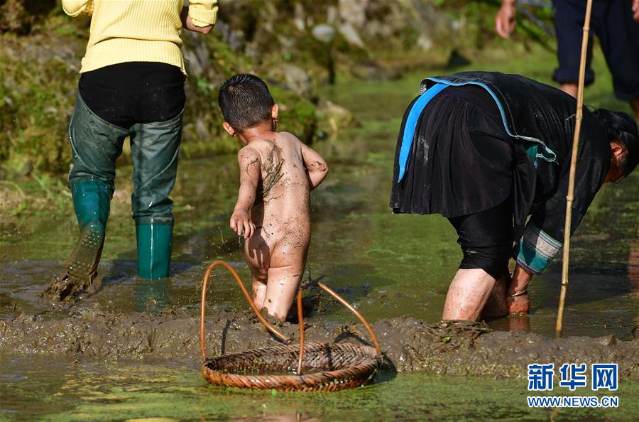 在黔桂烏英苗寨,小朋友在稻田里玩耍(4月16日攝)。  新華社記者 黃孝邦 攝
