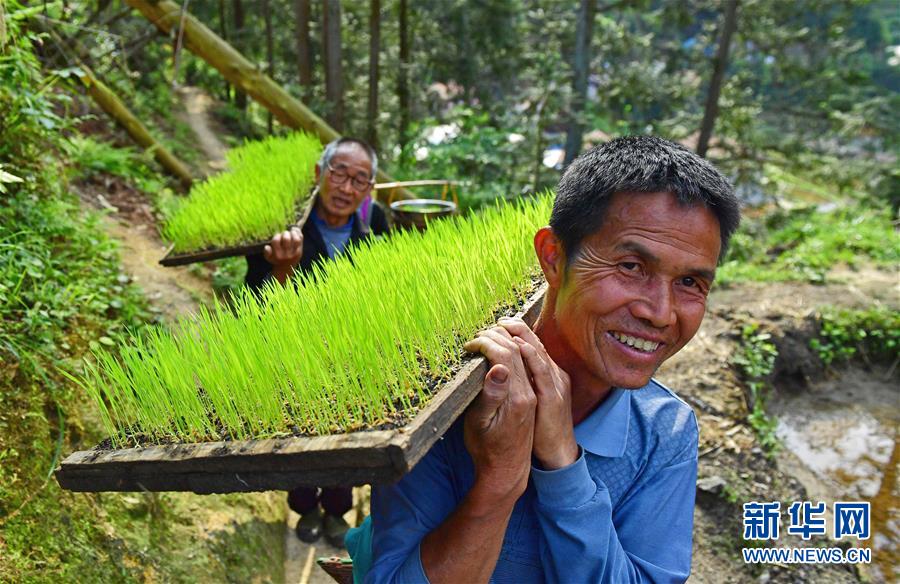 在黔桂烏英苗寨,村民扛著秧苗上山,準(zhǔn)備插秧(4月16日攝)。 新華社記者 黃孝邦 攝