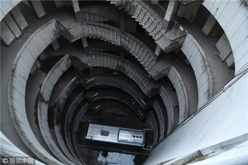 2018年12月6日,重慶江北紅旗河溝汽車站內,有一棟獨特的八層圓環(huán)狀建筑,底層每天有不少進出站的客車通行。據悉,這棟樓建于1990年,曾經是車站旅館,如今一、二兩層用于車站辦公,其余樓層已廢棄。為確保安全,三層以上已經被封鎖。圖為公交車穿過8層空心圓筒樓。徐勇/視覺中國