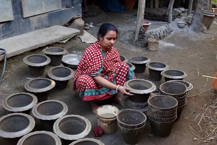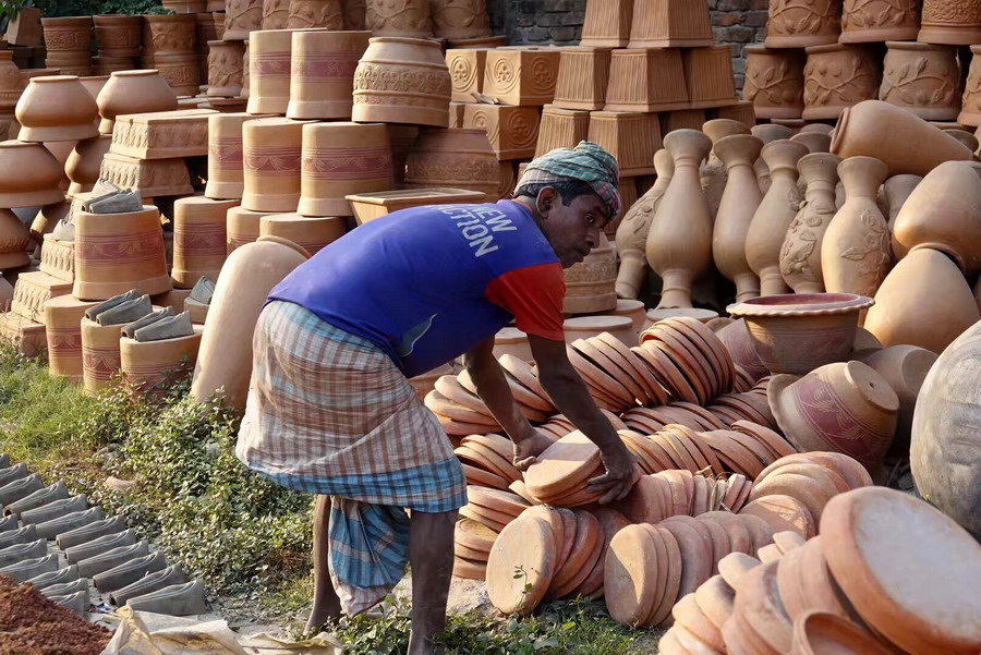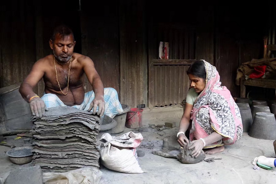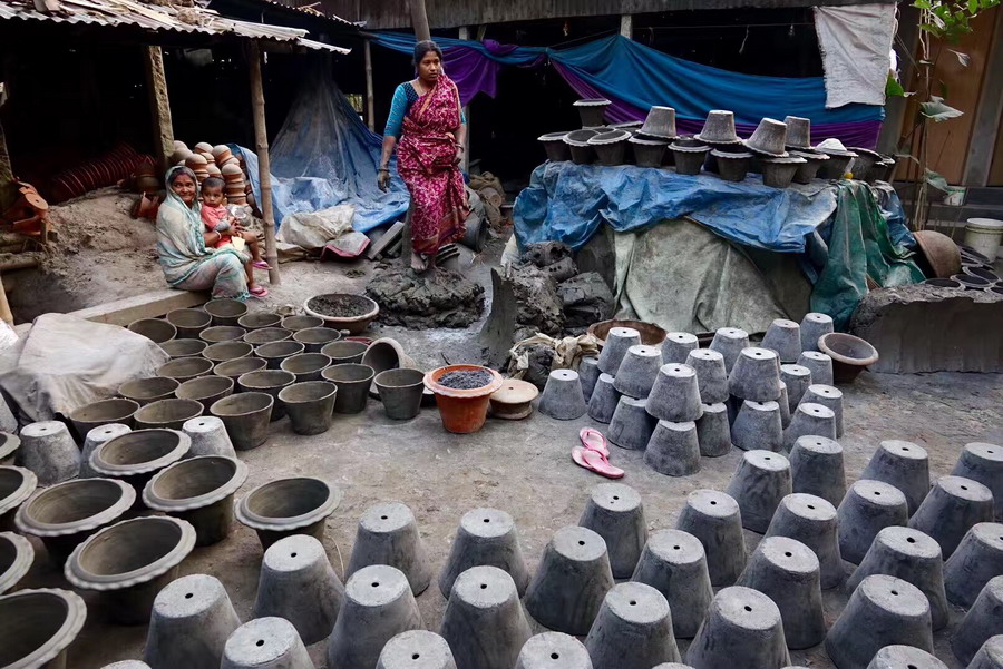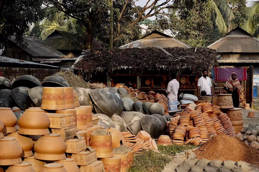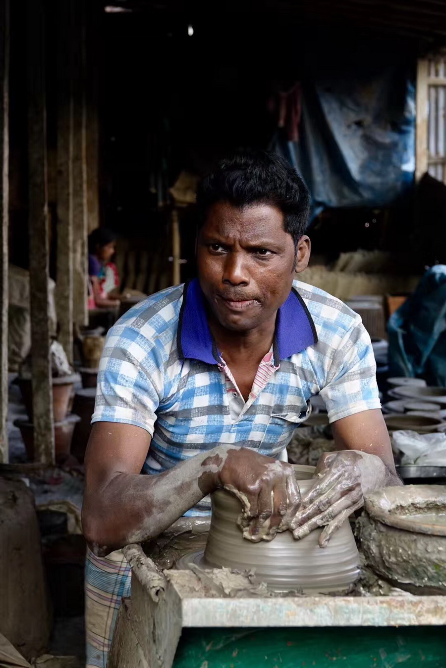 達(dá)卡遠(yuǎn)郊區(qū)一個(gè)印度教徒聚居的村莊,幾乎家家戶(hù)戶(hù)都開(kāi)辦制陶作坊,以傳統(tǒng)工藝制作陶盆、陶罐、陶盤(pán)和建筑裝飾陶器,遠(yuǎn)銷(xiāo)孟加拉國(guó)內(nèi)各地。李仁奇  攝