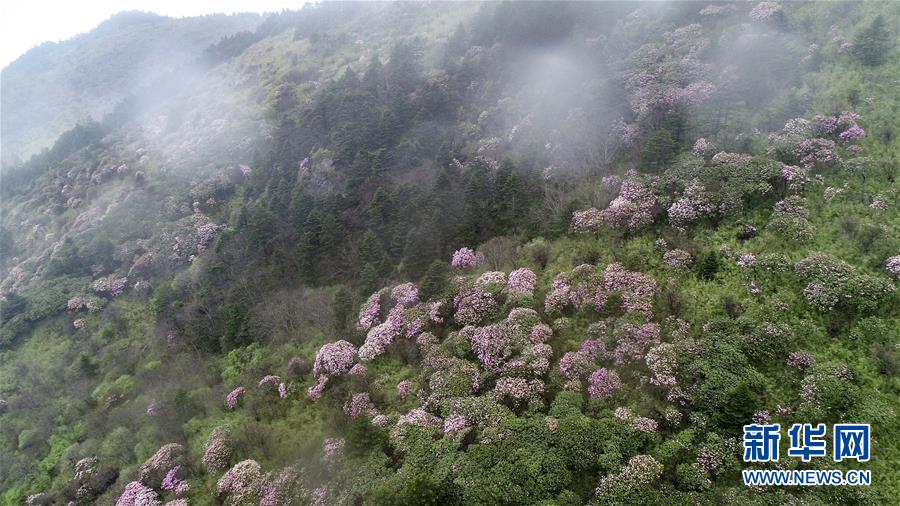 神農(nóng)架神農(nóng)頂景區(qū)盛開(kāi)的高山杜鵑(5月13日無(wú)人機(jī)拍攝)。 新華社記者 杜華舉 攝