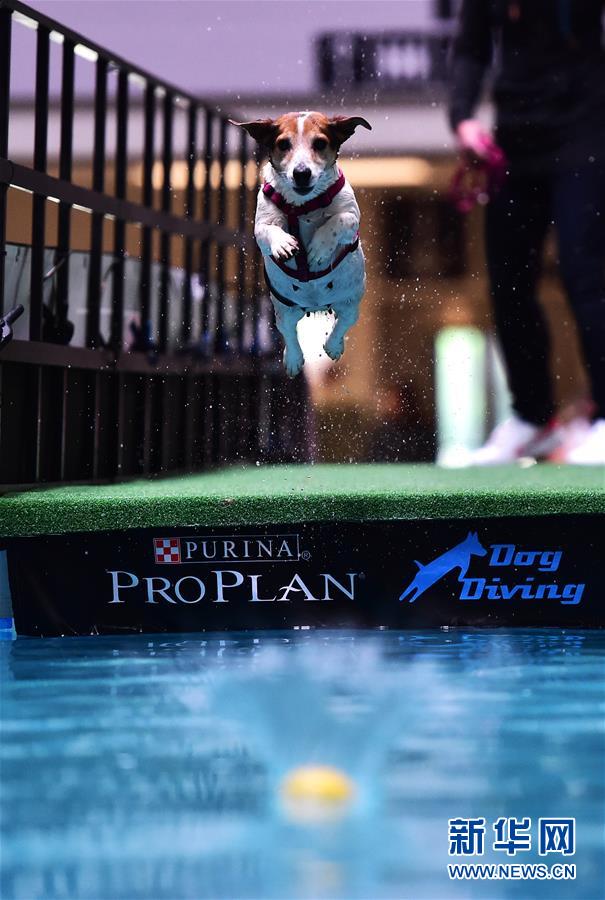 5月19日,在德國多特蒙德舉行的寵物展上,一只杰克羅素梗參加跳水比賽。 為期三天的德國多特蒙德“狗和貓”寵物展19日落幕。寵物展期間,人們帶著自己的“萌寵”來到會場,參與寵物跳水、舞蹈、選美等趣味比賽,并與其他寵物愛好者及展商交流互動。 新華社記者逯陽攝