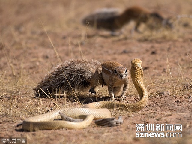 當(dāng)?shù)貢r(shí)間2016年10月25日,南非博茨瓦納的卡格拉格帝越界公園, 眼鏡蛇和地松鼠之間發(fā)生激烈打斗,但都沒(méi)有受傷。野生動(dòng)物攝影師Hannes Rossouw拍攝了這一過(guò)程。