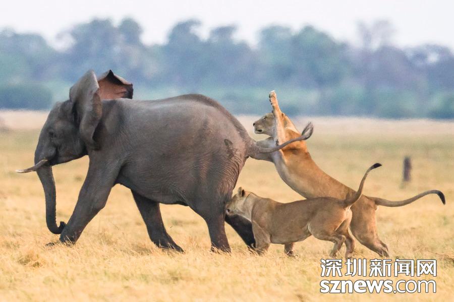英國(guó)攝影師詹姆斯(James Gifford)在博茨瓦納喬貝國(guó)家公園拍到一群獅子獵食大象的精彩畫面。在詹姆斯的鏡頭下,一頭母獅跳到了一頭小象的背上想要將其拿下,但僅憑一己之力又不能做到。但當(dāng)母獅的后援抵達(dá)時(shí),象群也趕到了現(xiàn)場(chǎng)。最終,小象回到了象群中獲得庇護(hù),而獅群也不得不悻悻離去。