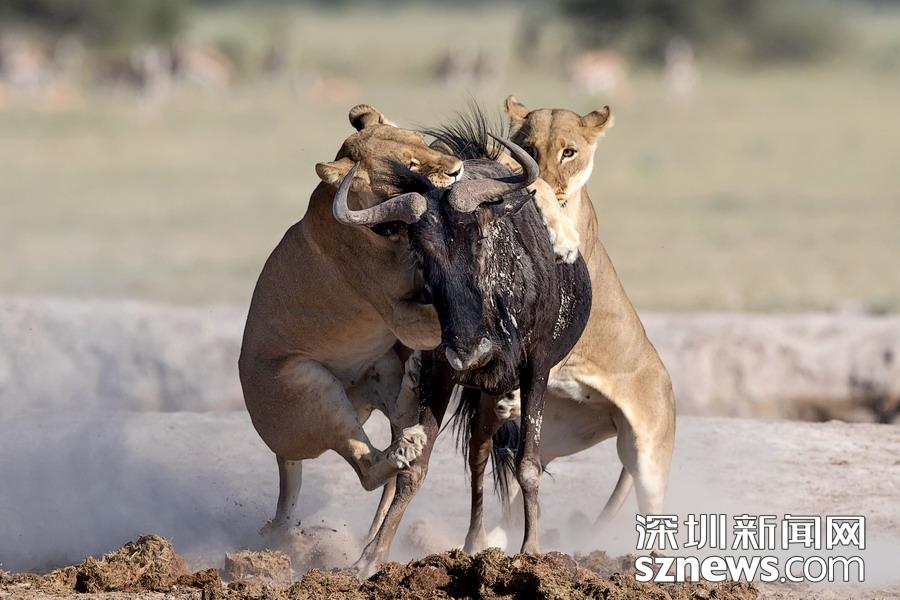 英國(guó)攝影師蘇-莫里斯(Sue Morri)在博茨瓦納Nxai Pan國(guó)家公園游玩,目睹了一場(chǎng)兇惡母獅獵食角馬的畫(huà)面。母獅甚至攀到了角馬背上,想要牢牢遏制住到手的“美餐”。強(qiáng)壯的角馬努力地與母獅抗?fàn)?,竭力想要保住自己的性命,但最終還是不敵母獅被拿下,最后成了母獅孩子們的盤(pán)中餐。
