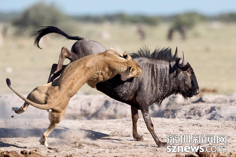 英國攝影師蘇-莫里斯(Sue Morri)在博茨瓦納Nxai Pan國家公園游玩,目睹了一場兇惡母獅獵食角馬的畫面。母獅甚至攀到了角馬背上,想要牢牢遏制住到手的“美餐”。強壯的角馬努力地與母獅抗?fàn)?,竭力想要保住自己的性命,但最終還是不敵母獅被拿下,最后成了母獅孩子們的盤中餐。