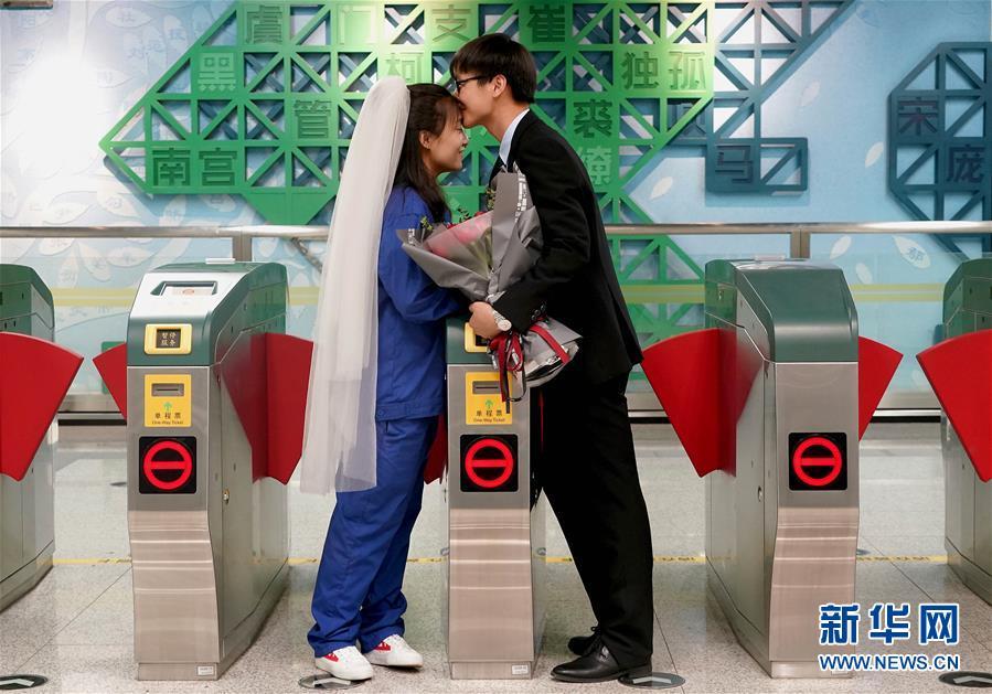 5月20日,兩名參與地鐵5號線建設(shè)的工作人員在求婚后拍照留念。 當日,鄭州地鐵5號線開始初期運營。作為鄭州軌道交通線網(wǎng)中首條環(huán)線,5號線全長40余公里,設(shè)站32座。 新華社記者李安攝