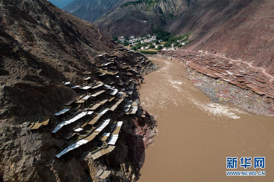 這是西藏芒康縣納西民族鄉(xiāng)的古鹽田景觀(5月22日無人機(jī)拍攝)。 位于西藏昌都芒康縣瀾滄江畔的古鹽田,至今仍保持最原始的手工曬鹽方式。據(jù)史料記載,唐朝時期當(dāng)?shù)鼐烷_始曬鹽。鹽田在瀾滄江兩岸依山而建,由多根木柱搭架,架上用透水性強(qiáng)的泥土鋪成平面夯實,當(dāng)?shù)鼐用駨臑憸娼系柠}井、鹽池中取出鹵水倒入鹽田,經(jīng)陽光蒸曬、風(fēng)干,結(jié)晶成鹽。遠(yuǎn)遠(yuǎn)望去,鹽田錯落有致,田中鹵水宛若鏡面,形成壯麗奇觀。 新華社記者 李鑫 攝