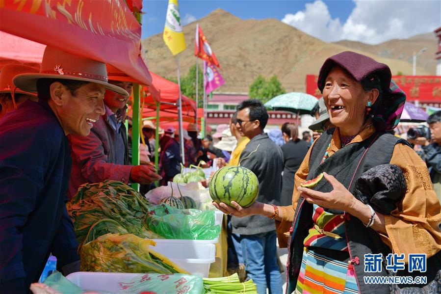 5月28日,當(dāng)?shù)剞r(nóng)牧民在白朗縣豐登廣場品嘗西瓜。 近日,西藏日喀則市白朗縣1.46萬畝瓜果蔬菜喜獲豐收。百姓們在縣里的豐登廣場載歌載舞,慶祝白朗縣第九屆果蔬采摘節(jié)。 新華社記者 張汝鋒 攝