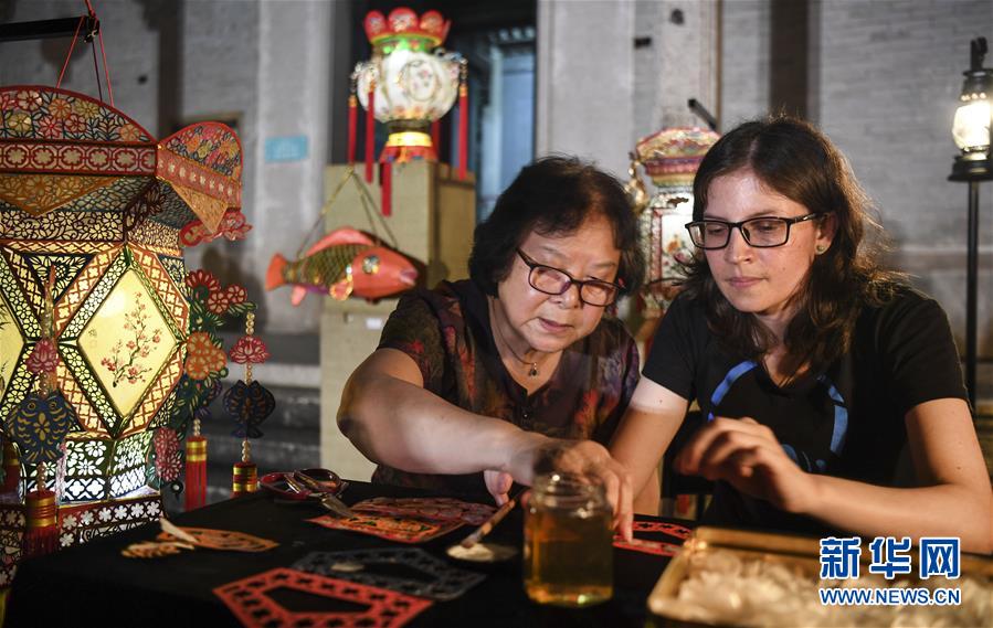 國家級非遺傳承人楊玉榕(左)在古驛道陳芳家宅外廣場指導外國留學生制作彩燈(5月31日攝)。