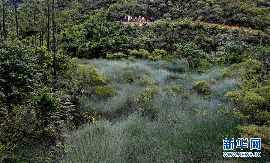 6月1日,游人在香山古驛道旁欣賞富有野趣的“煙波潮涌”景色(無人機拍攝)。