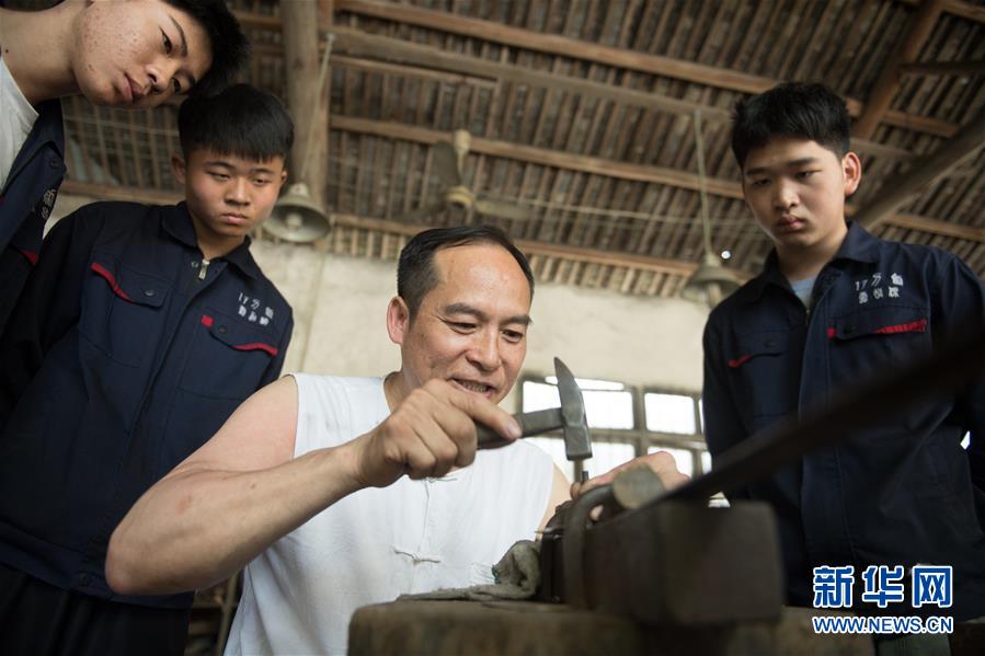 5月21日,鄭國(guó)榮在一把寶劍上鏨刻龍鳳紋,徒弟們?cè)谂赃厡W(xué)習(xí)。 新華社記者 翁忻旸 攝