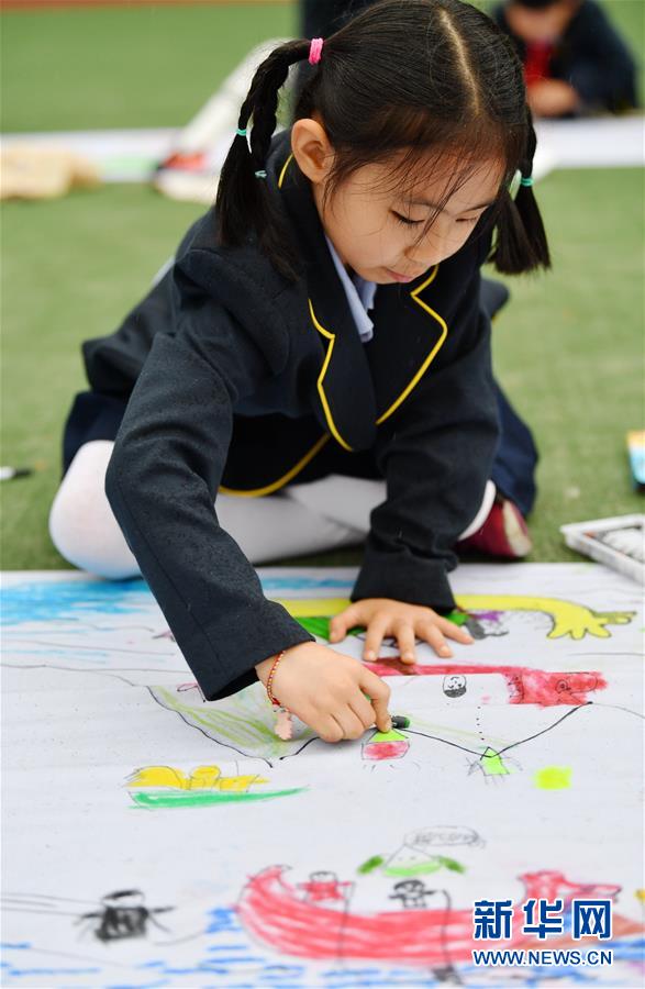 6月5日,陜西師范大學(xué)附屬小學(xué)的學(xué)生在長卷上畫龍舟。
