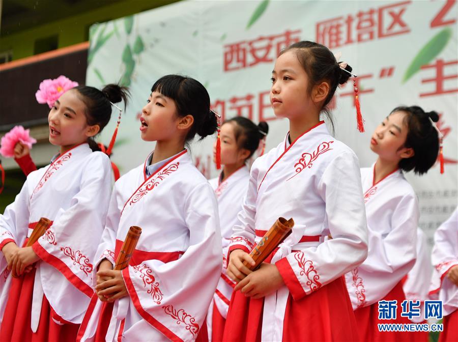當(dāng)日,陜西師范大學(xué)附屬小學(xué)在位于西安的校園里舉行傳統(tǒng)民俗活動(dòng)迎接即將到來的端午節(jié)。