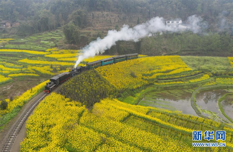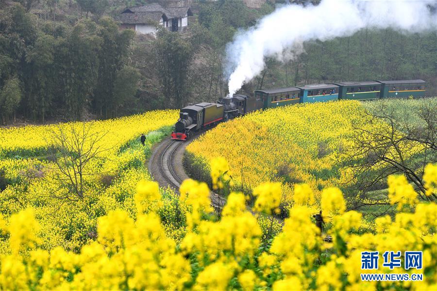 3月20日,一列嘉陽小火車在油菜花叢中穿行。