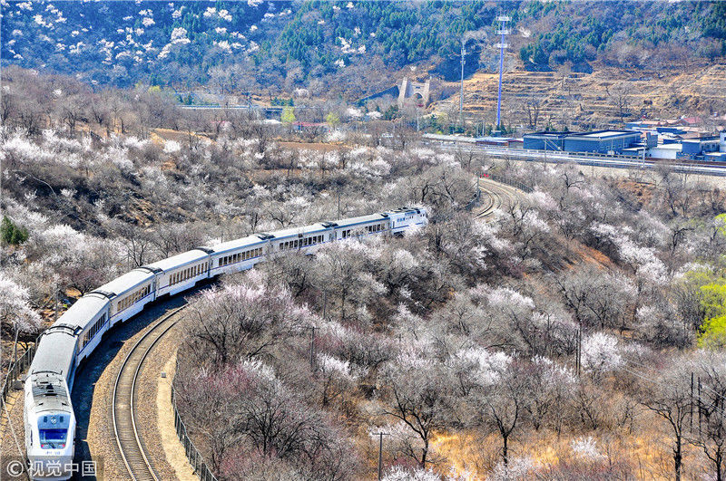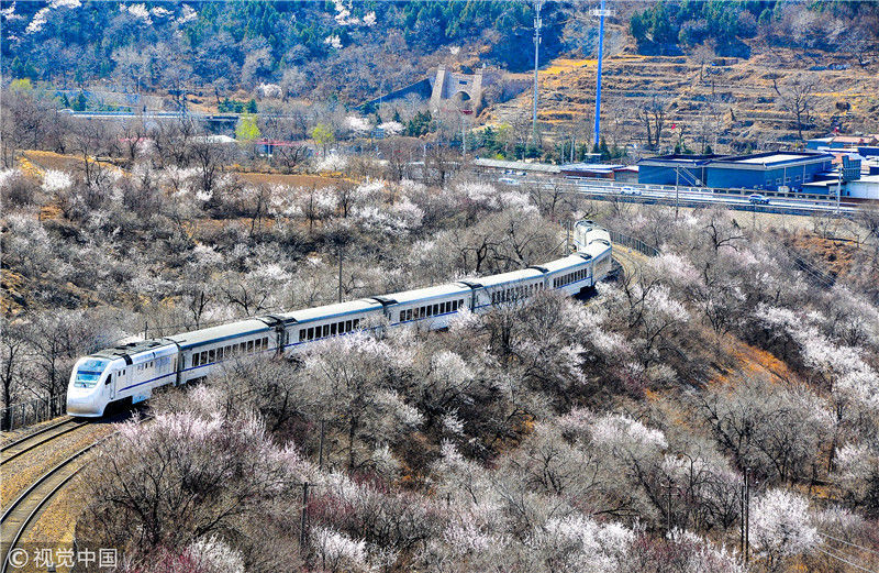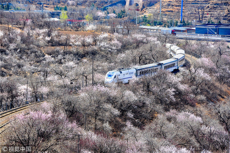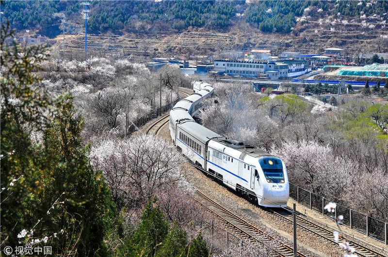2019年3月22日,北京居庸關(guān)附近的山花盛開,S2線列車穿行在花海之中,構(gòu)成一幅美麗的畫面。時永平/千龍圖像/視覺中國 編輯/陳進(jìn)