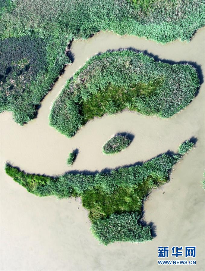 這是天津市寧河區(qū)七里海濕地內(nèi)蘆葦和水面形成的圖案(6月22日無(wú)人機(jī)拍攝)。