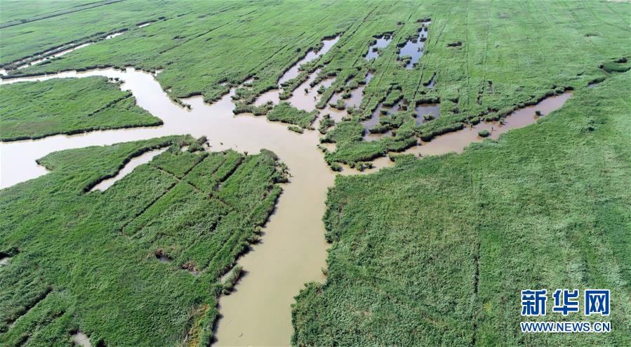 這是天津市寧河區(qū)七里海濕地內(nèi)蘆葦和水面形成的圖案(6月22日無人機拍攝)。新華社記者 岳月偉 攝