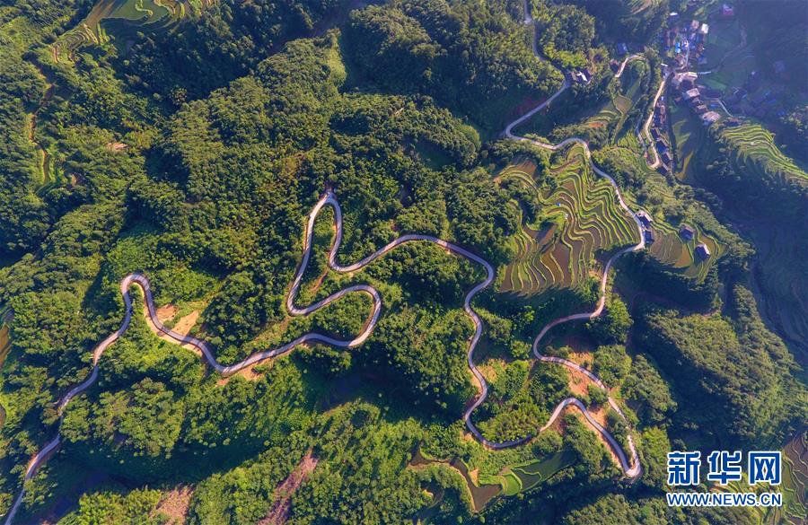 這是融水苗族自治縣桿洞鄉(xiāng)百秀村孔門苗寨的公路(6月14日無人機(jī)拍攝)。新華社記者 黃孝邦 攝