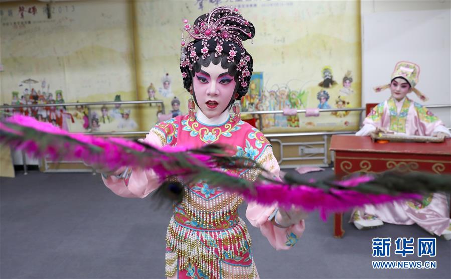 陸瑞徽(左)和利文喆在表演折子戲《艷曲醉周郎》(6月8日攝)。 聲輝粵劇推廣協(xié)會成立于2003年,是香港重要粵劇藝術團體之一,致力于向青少年推廣粵劇。協(xié)會目前有兩個初班,3個中班,一個青少年班。粵劇又稱“廣東大戲”,表演技藝包括“唱做念打”,即唱功、身段、臺詞、武打,主要流行于廣東、廣西和香港、澳門等地區(qū)。2009年,粵劇被列入聯(lián)合國教科文組織人類非物質文化遺產(chǎn)代表作名錄,今年正逢十周年。 新華社記者 吳曉初 攝