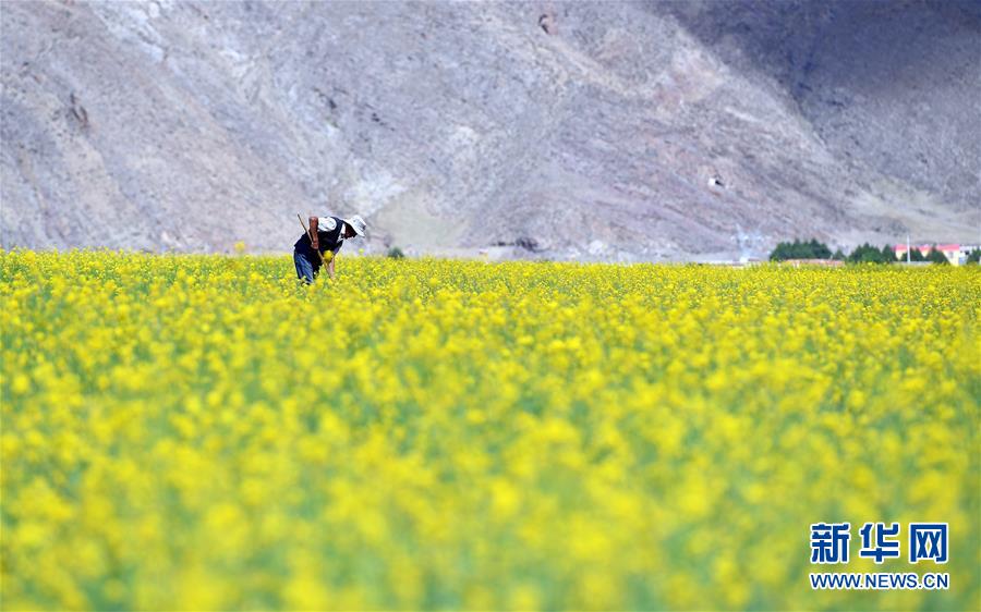 7月2日,拉薩市堆龍德慶區(qū)德慶鄉(xiāng)的村民在打理油菜花田。 近日,西藏各地的油菜花盛開,呈現(xiàn)出生機(jī)勃勃的夏日美景。 新華社記者 李鑫 攝