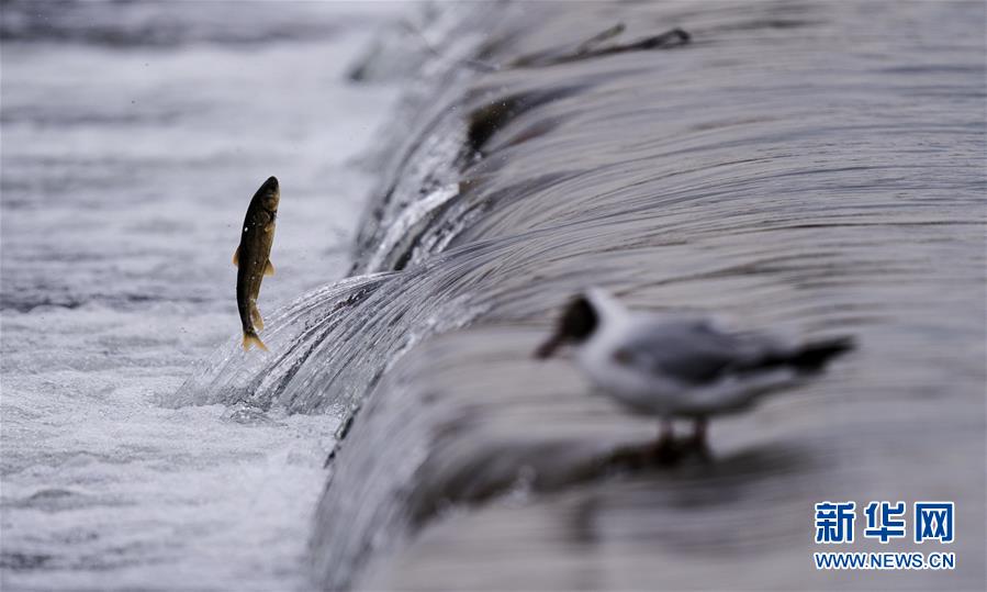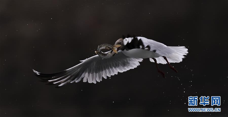 7月6日,在青海省剛察縣沙柳河里,一只棕頭鷗捕捉到一只躍起的湟魚。 新華社記者 劉金海攝