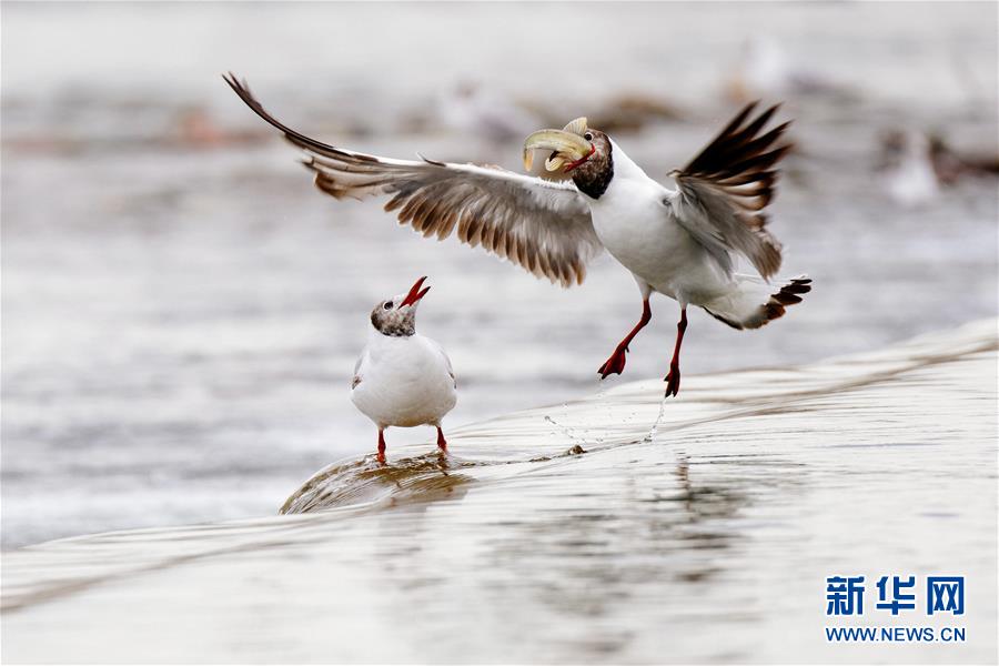 7月6日,在青海省剛察縣沙柳河,棕頭鷗在覓食。 新華社記者 張宏祥攝