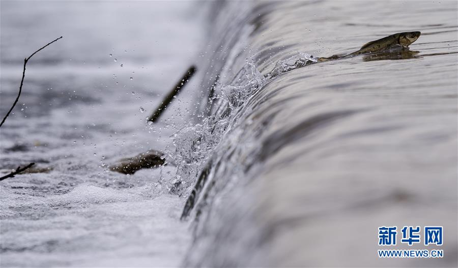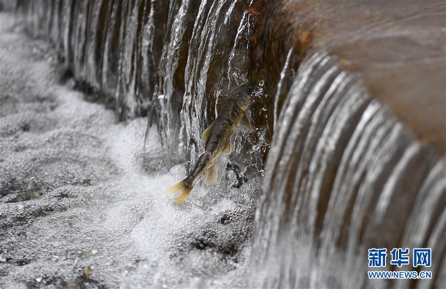 7月6日,在青海省剛察縣沙柳河里,一只湟魚躍起向上洄游。 新華社記者 劉金海攝