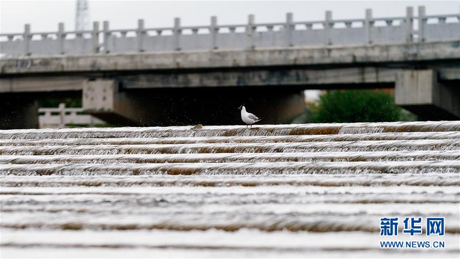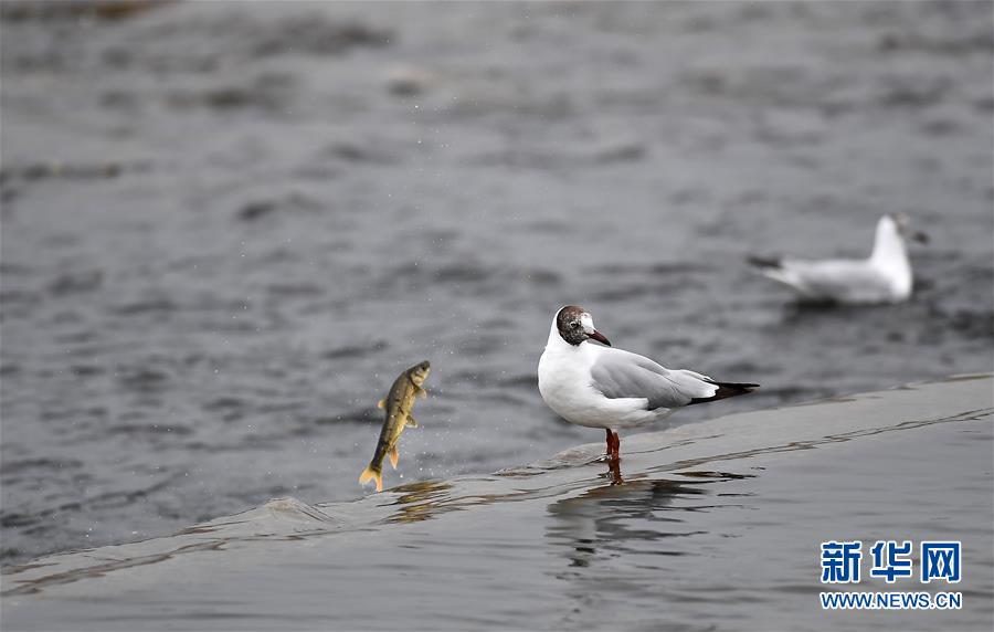 7月6日,在青海省剛察縣沙柳河里,一只棕頭鷗捕捉到一只躍起的湟魚。 新華社記者 吳剛攝
