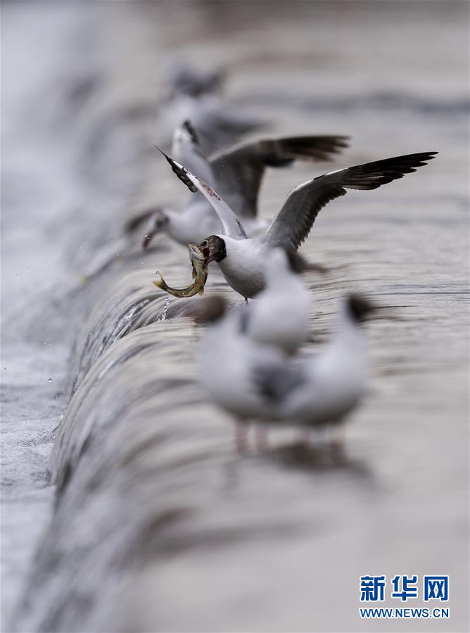7月6日,在青海省剛察縣沙柳河里,幾只棕頭鷗在捕捉躍起的湟魚。 新華社記者 費(fèi)茂華攝