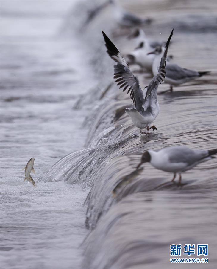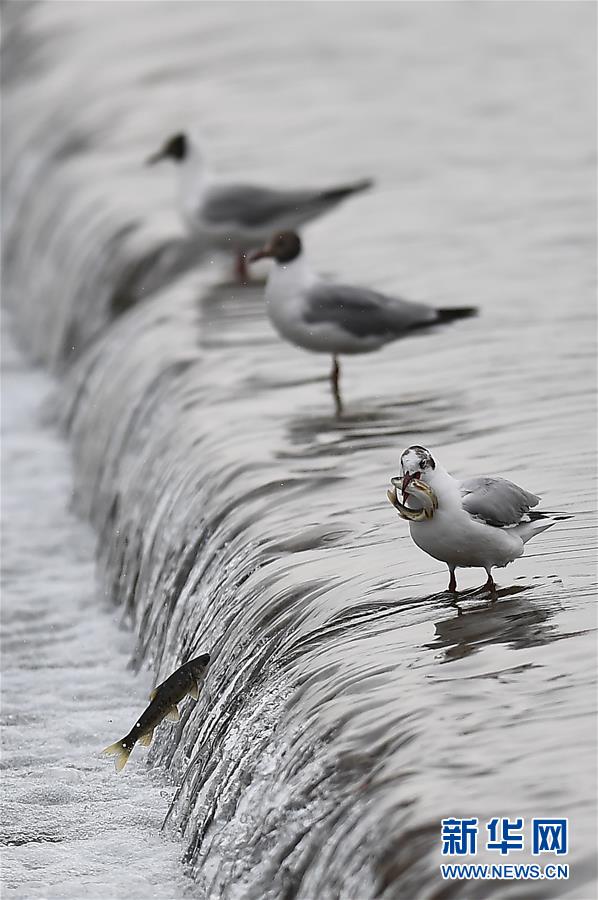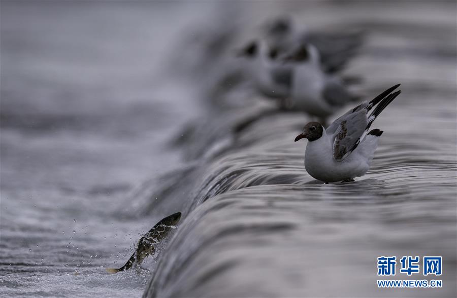 7月6日,在青海省剛察縣沙柳河里,幾只棕頭鷗等待捕捉躍起的湟魚。 新華社記者 費(fèi)茂華攝