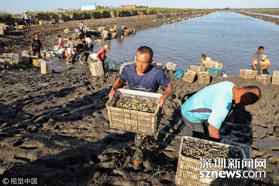 時下正是沿海地區(qū)海蟶收獲的季節(jié),在江蘇連云港海邊的灘涂上,漁民們將收獲的海蟶裝箱外運,一片忙碌。