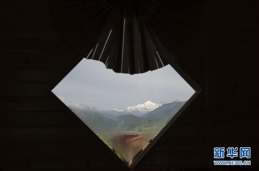 透過阿尼瑪卿雪山附近一個(gè)農(nóng)家樂的窗戶遙望阿尼瑪卿雪山(7月10日攝)。 新華社記者 費(fèi)茂華 攝