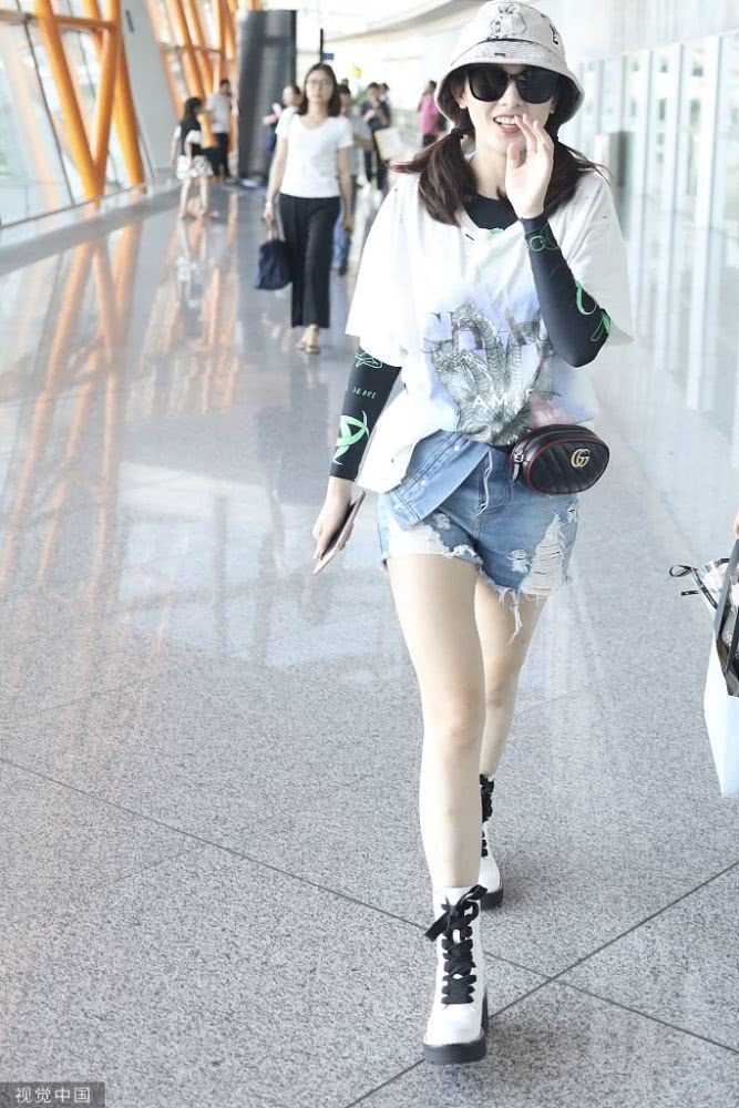 內(nèi)地女星彭小苒現(xiàn)身機(jī)場,穿印花T恤牛仔短褲,白色馬丁靴很時髦