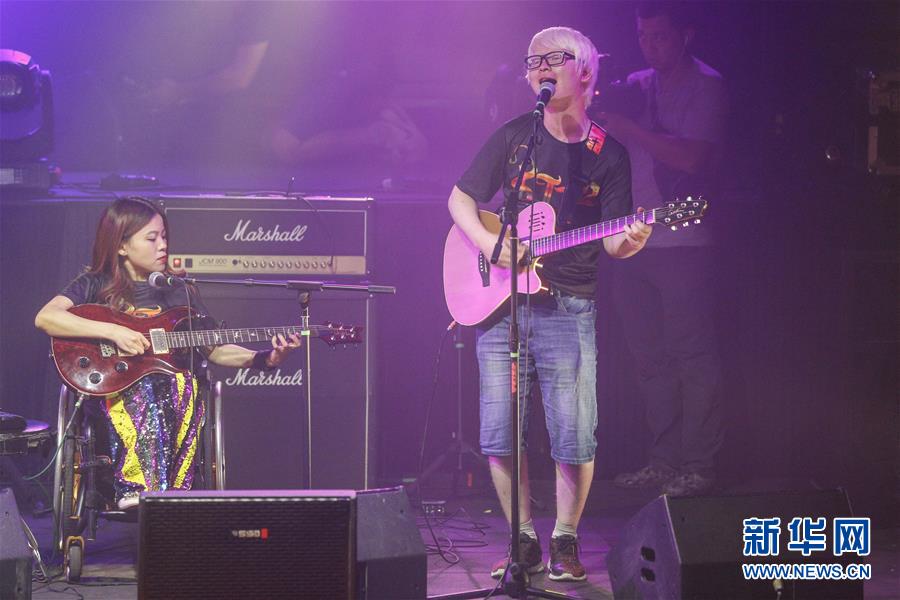 8月14日,8772樂(lè)隊(duì)成員謝航程(右)和程利婷在演唱會(huì)上表演。新華社記者張玉薇攝