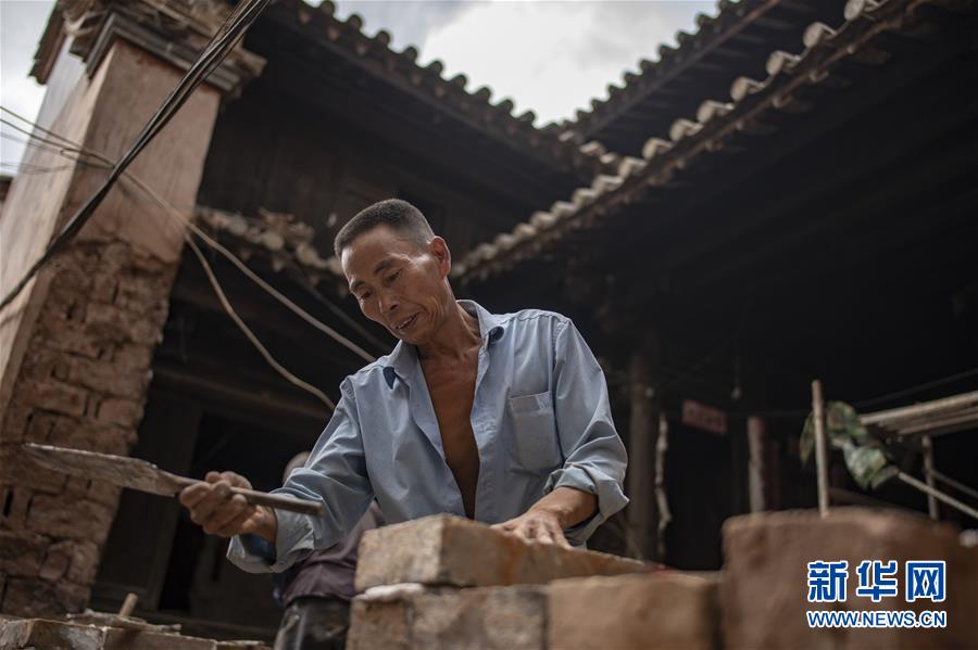 工人王建雄在修繕石屏縣異龍鎮(zhèn)符家營村189號(hào)民居的圍墻(8月8日攝)。新華社記者 江文耀 攝