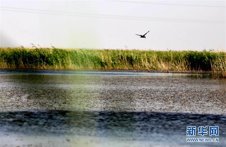 一只候鳥(niǎo)在青土湖水面飛翔(6月13日攝)。位于巴丹吉林沙漠和騰格里沙漠夾縫中的青土湖,是甘肅省武威市民勤縣的“沙漠之湖”,也是當(dāng)?shù)厣鷳B(tài)變遷的“晴雨表”。新華社記者 郭剛 攝