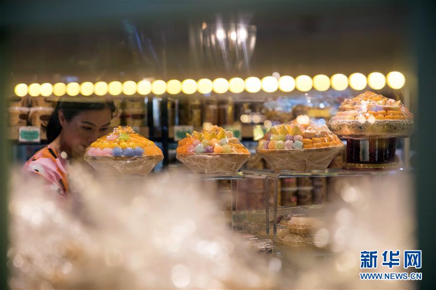 9月1日,顧客在泰國曼谷著名的“九姐妹甜點”店挑選傳統(tǒng)泰式甜點。新華社記者 張可任 攝