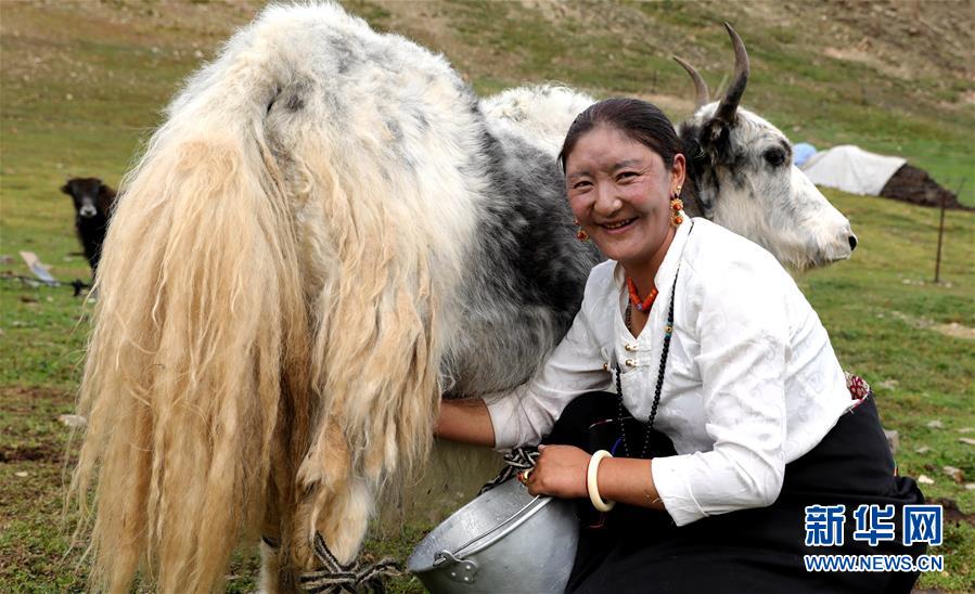 在青海省玉樹藏族自治州治多縣治渠鄉(xiāng)同卡村,村民昂文西讓的妻子布沙措江卓瑪正在擠牛奶(9月12日攝)。新華社記者 韓方方 攝