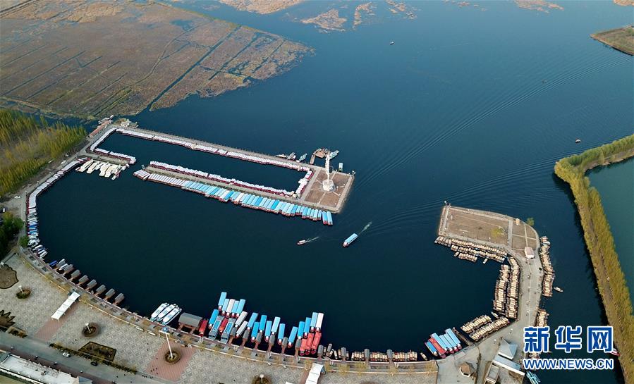 游船在白洋淀旅游碼頭內(nèi)行駛(4月10日無人機(jī)拍攝)。新華社記者牟宇攝